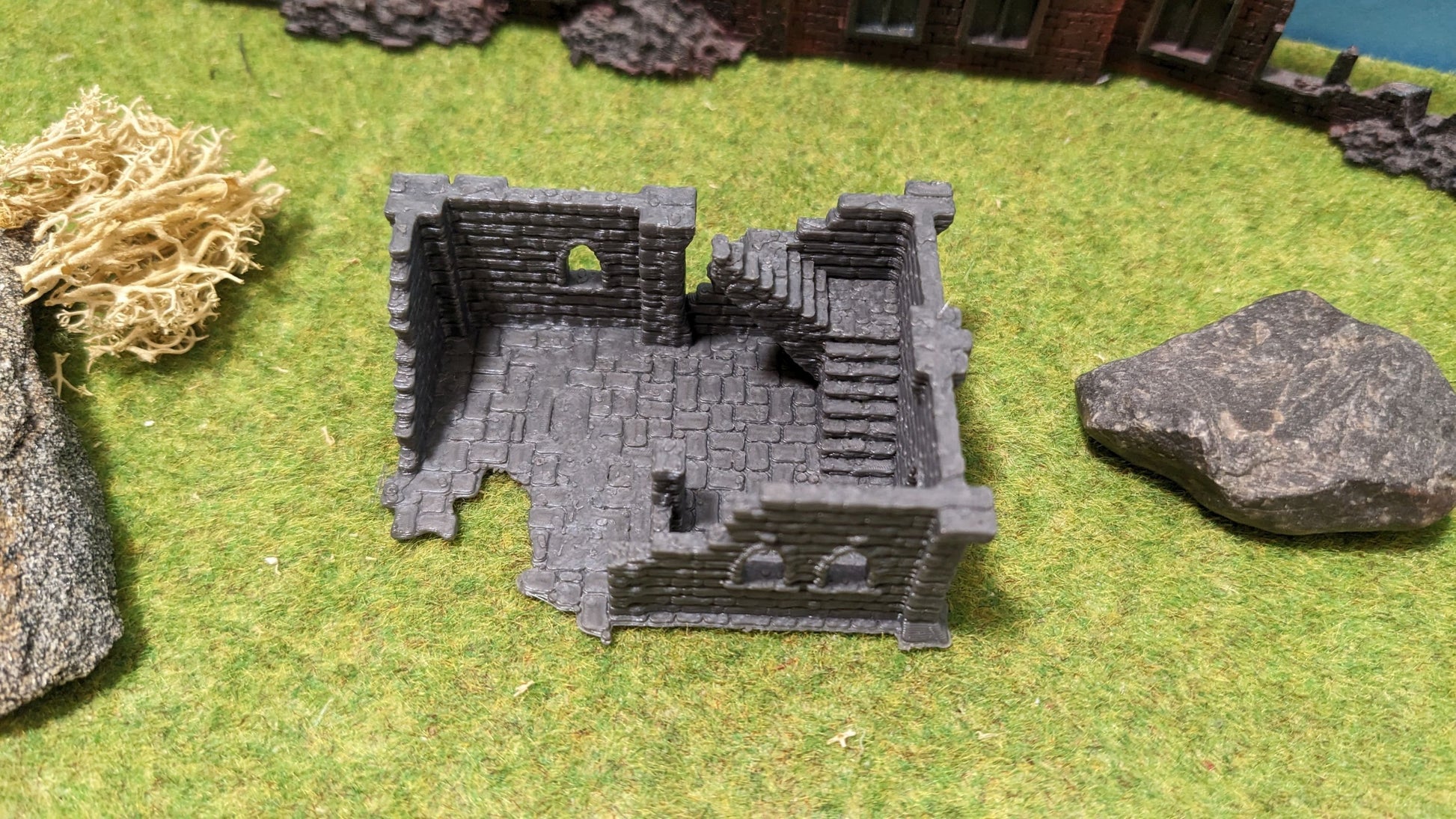 Die Ruine ist unbemalt in Grau und besteht aus hochwertigem PLA-Kunststoff. Sie lässt sich individuell gestalten und passt perfekt in mittelalterliche, ländliche oder zerfallene Umgebungen.