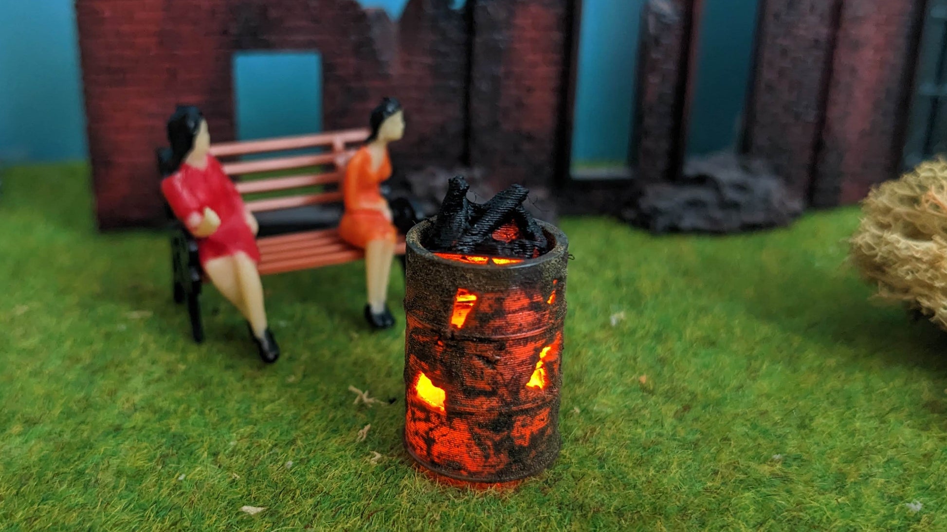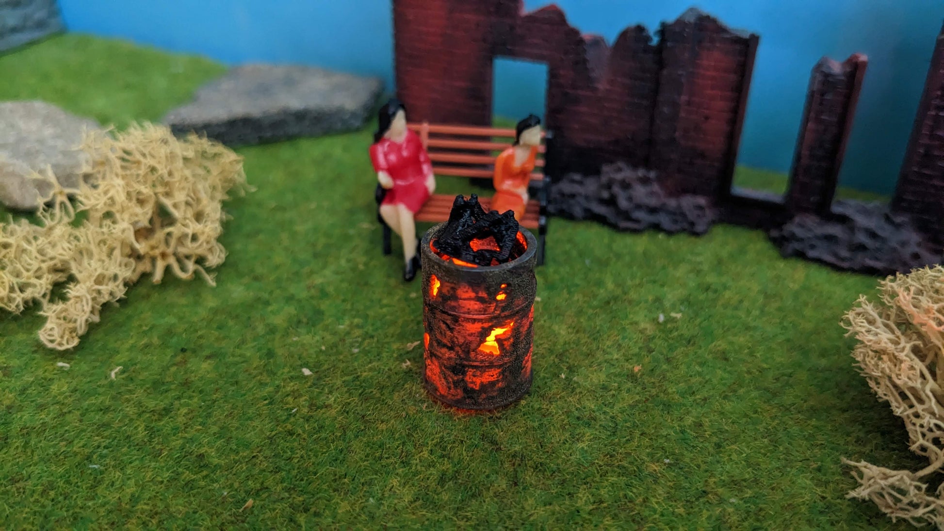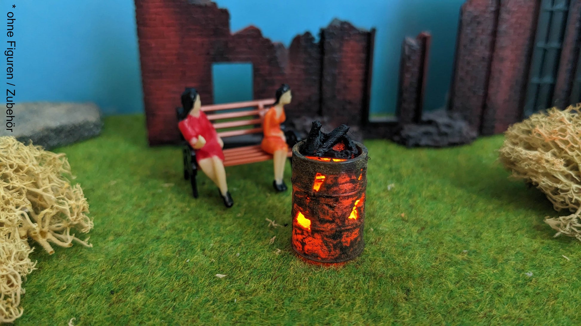 Brennendes Fass / Feuertonne mit Flacker-LED (1:45)