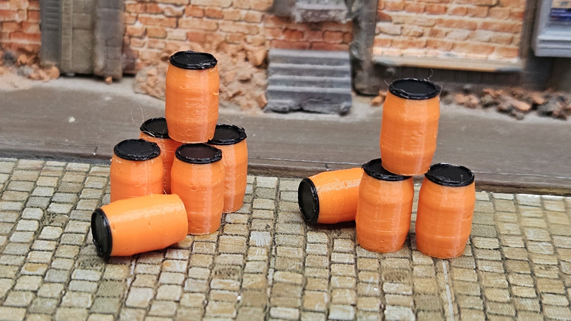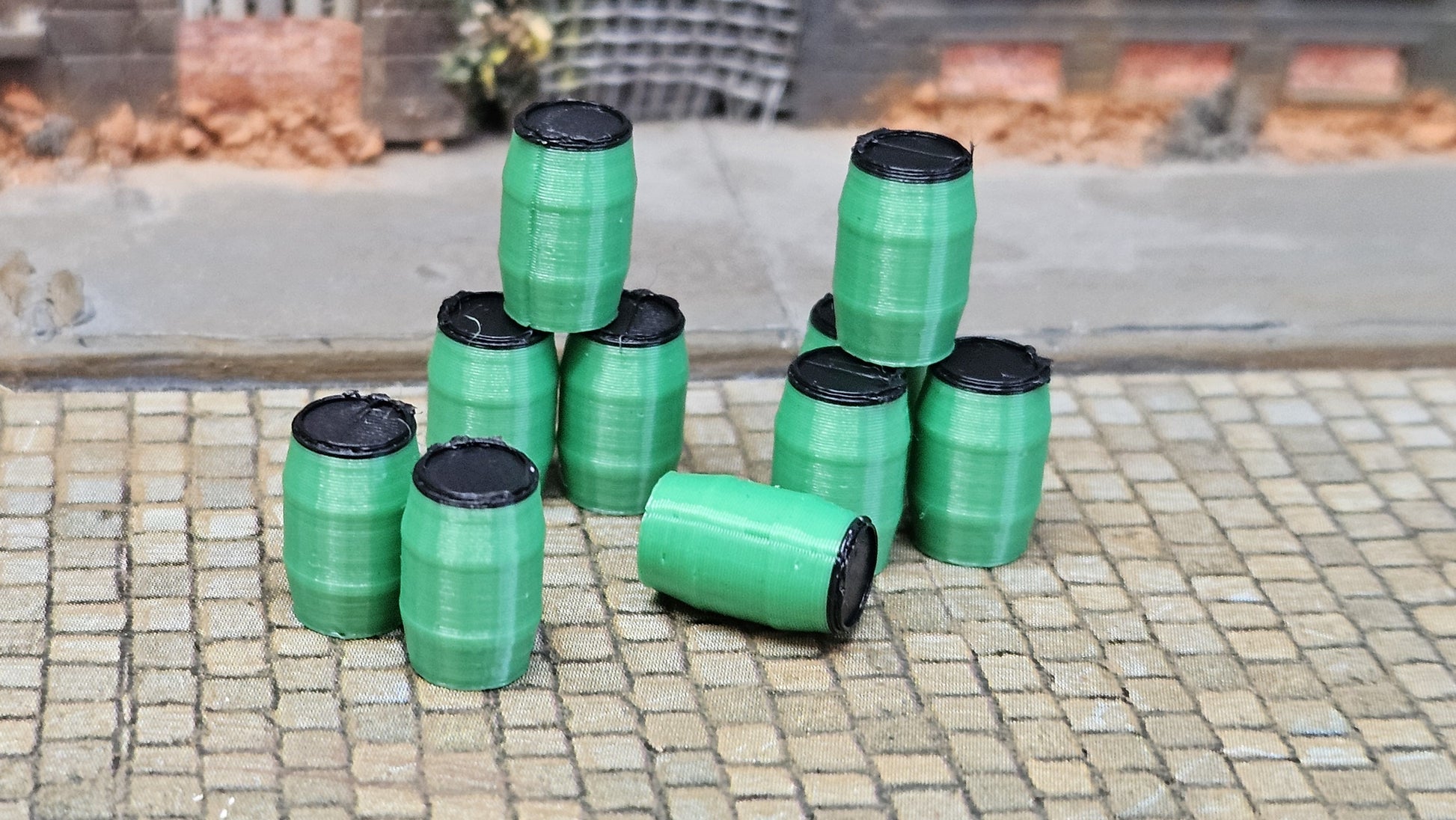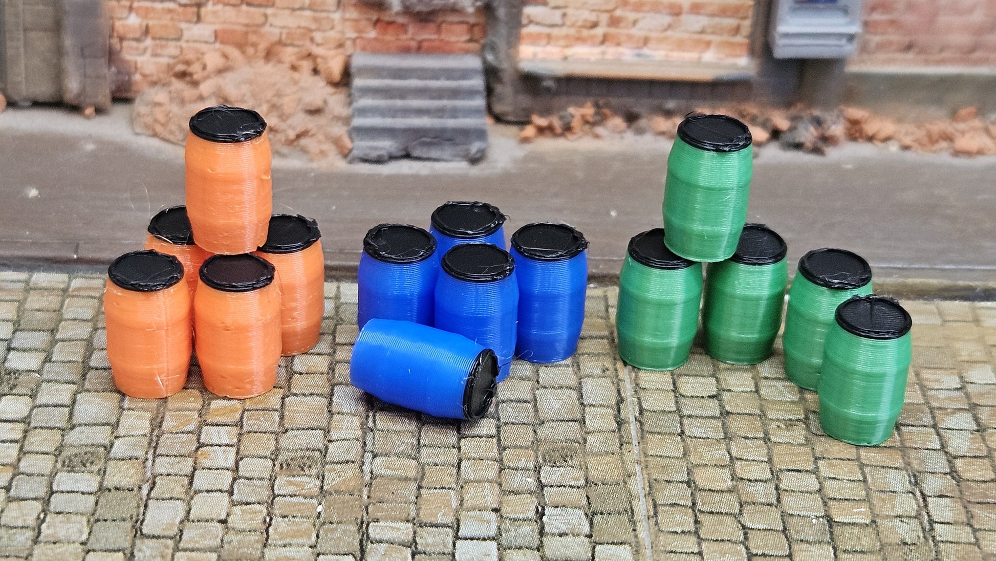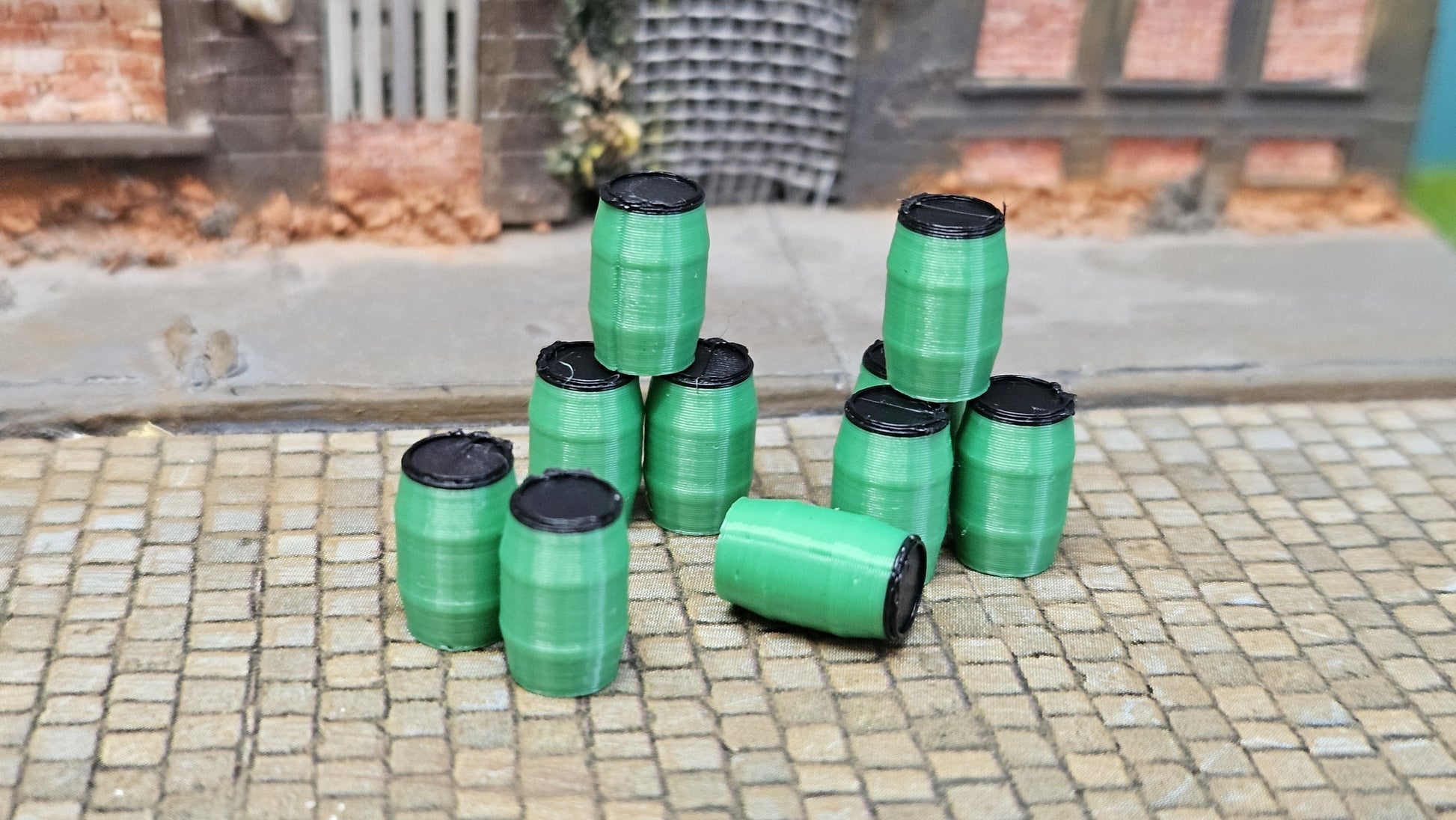 Diese detailreichen Kunststofffässer sind die perfekte Ergänzung für Industrie- und Bahnhofszenen, Baustellen oder als LKW-Ladung. Dank des hochwertigen Mehrfarb-3D-Drucks wirken die Fässer realistisch und können direkt eingesetzt werden – eine nachträgliche Lackierung ist nicht nötig.