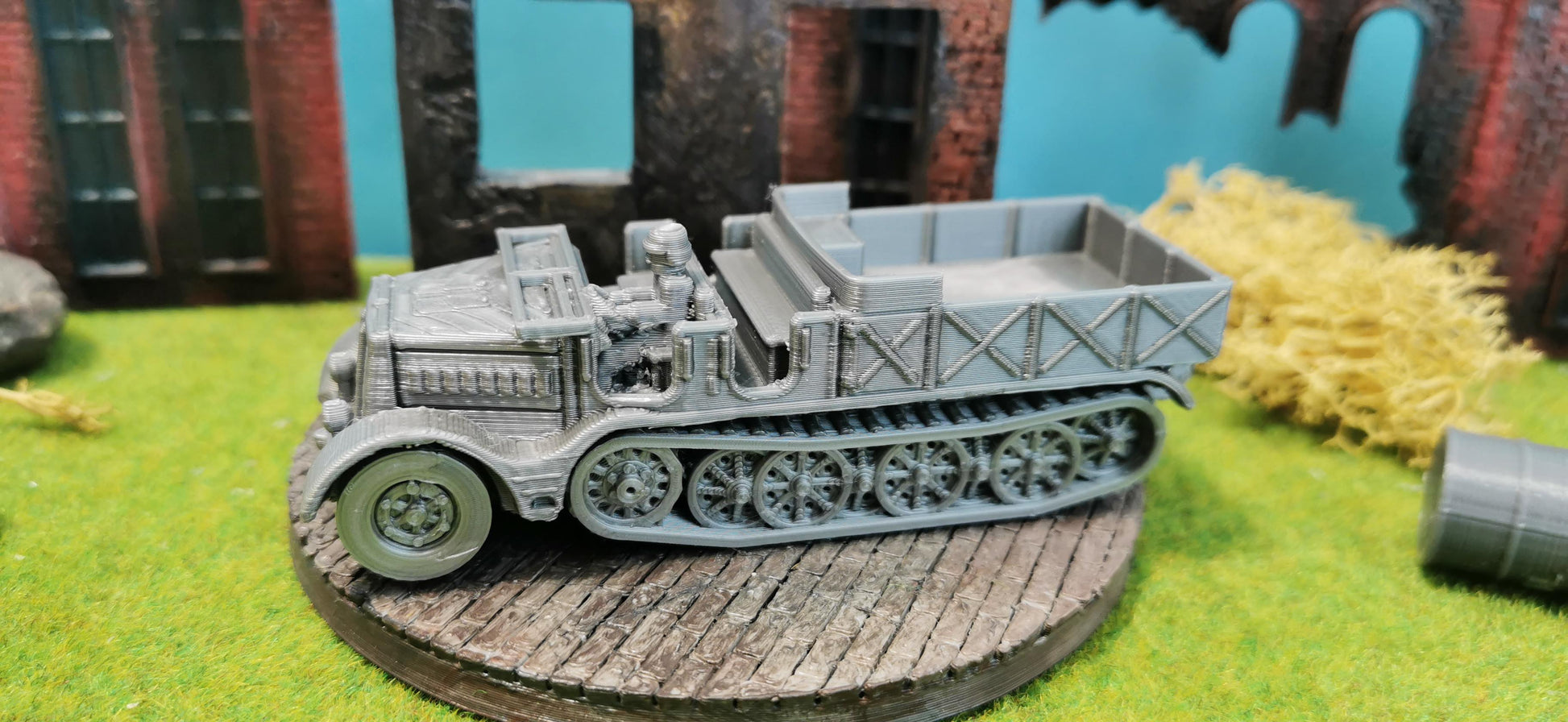 Das Sd.Kfz. 9, auch bekannt als "Famo", war eine der stärksten Halbkettenzugmaschinen der Wehrmacht. Diese Variante mit offener Fahrerkabine und Pritsche diente primär dem Transport schwerer Ausrüstung, Artilleriegeschütze oder auch beschädigter Panzer. Ihre enorme Zugkraft und Geländegängigkeit machten sie unverzichtbar in vielen Front- und Nachschuboperationen.