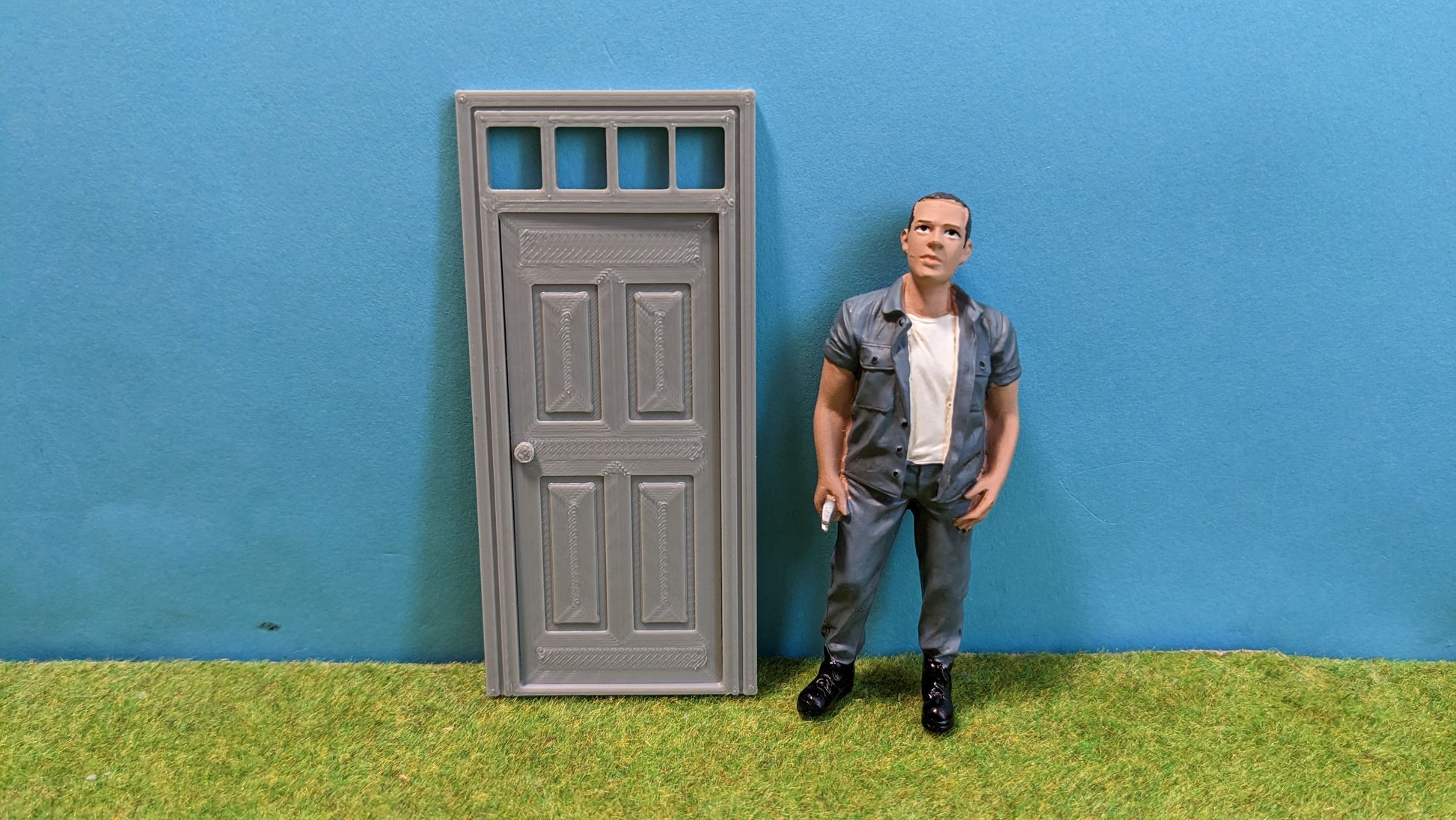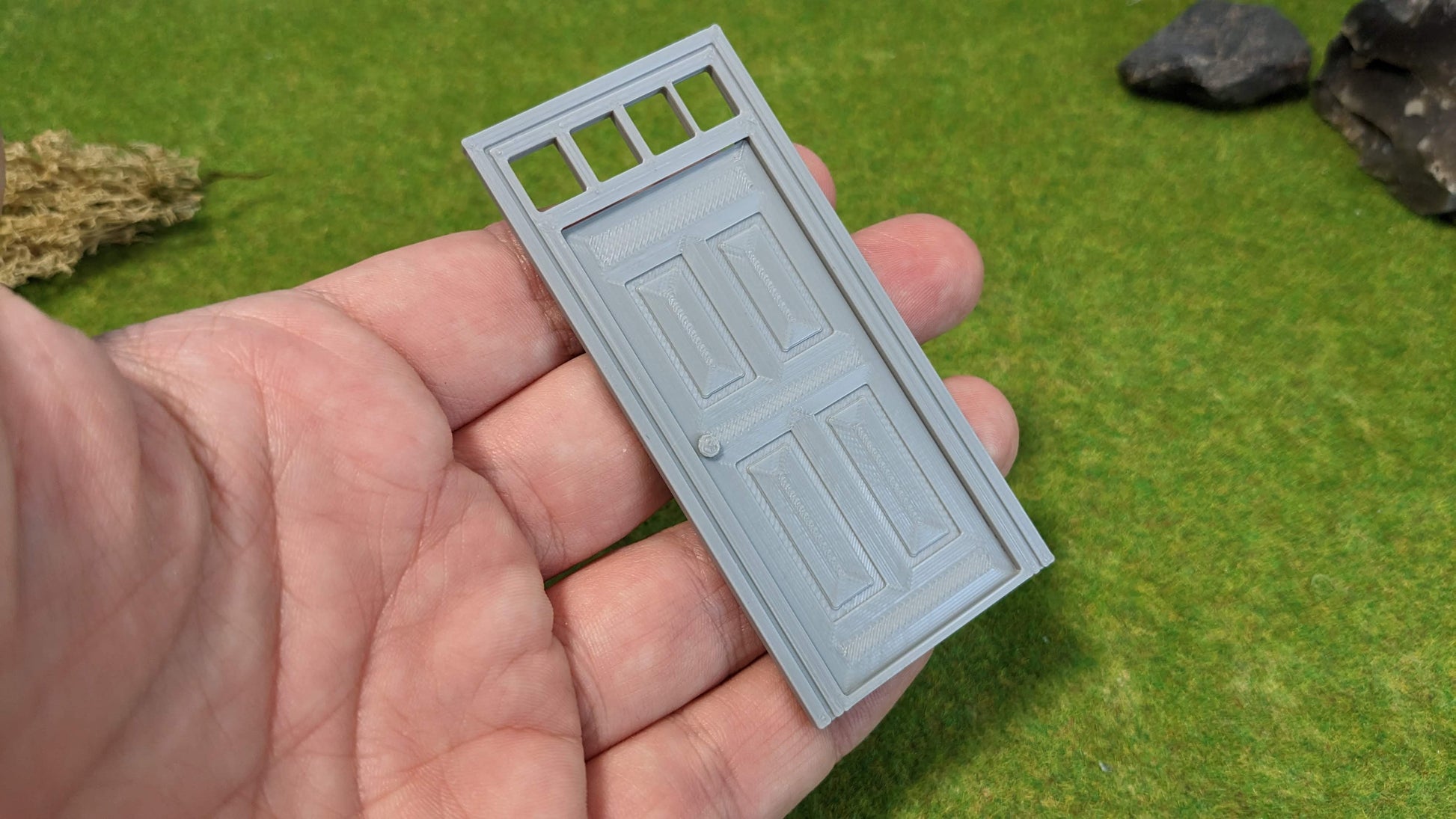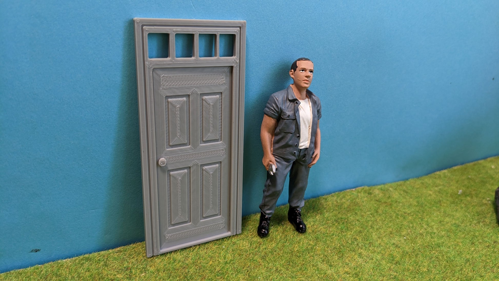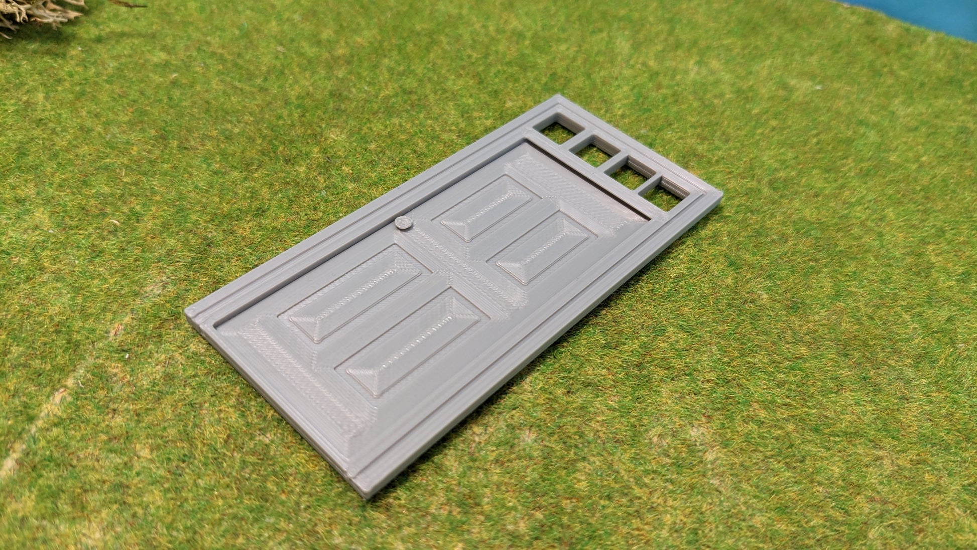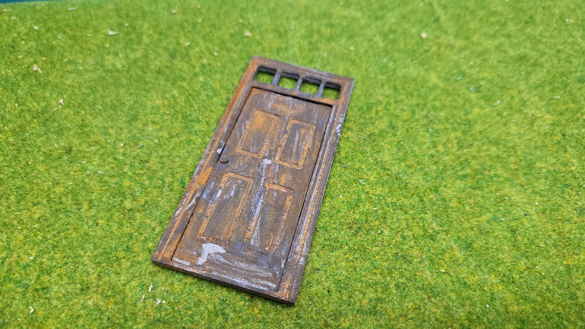 Detailreiche Haustür mit Fenster oben, ideal für Häuser, Fabriken oder Bahnhöfe – perfekt als Deko für LGB® (Spur G) und Playmobil®-Welten. Die Tür ist ohne Verglasung und im klassischen Grau oder Rostlook hergestellt.