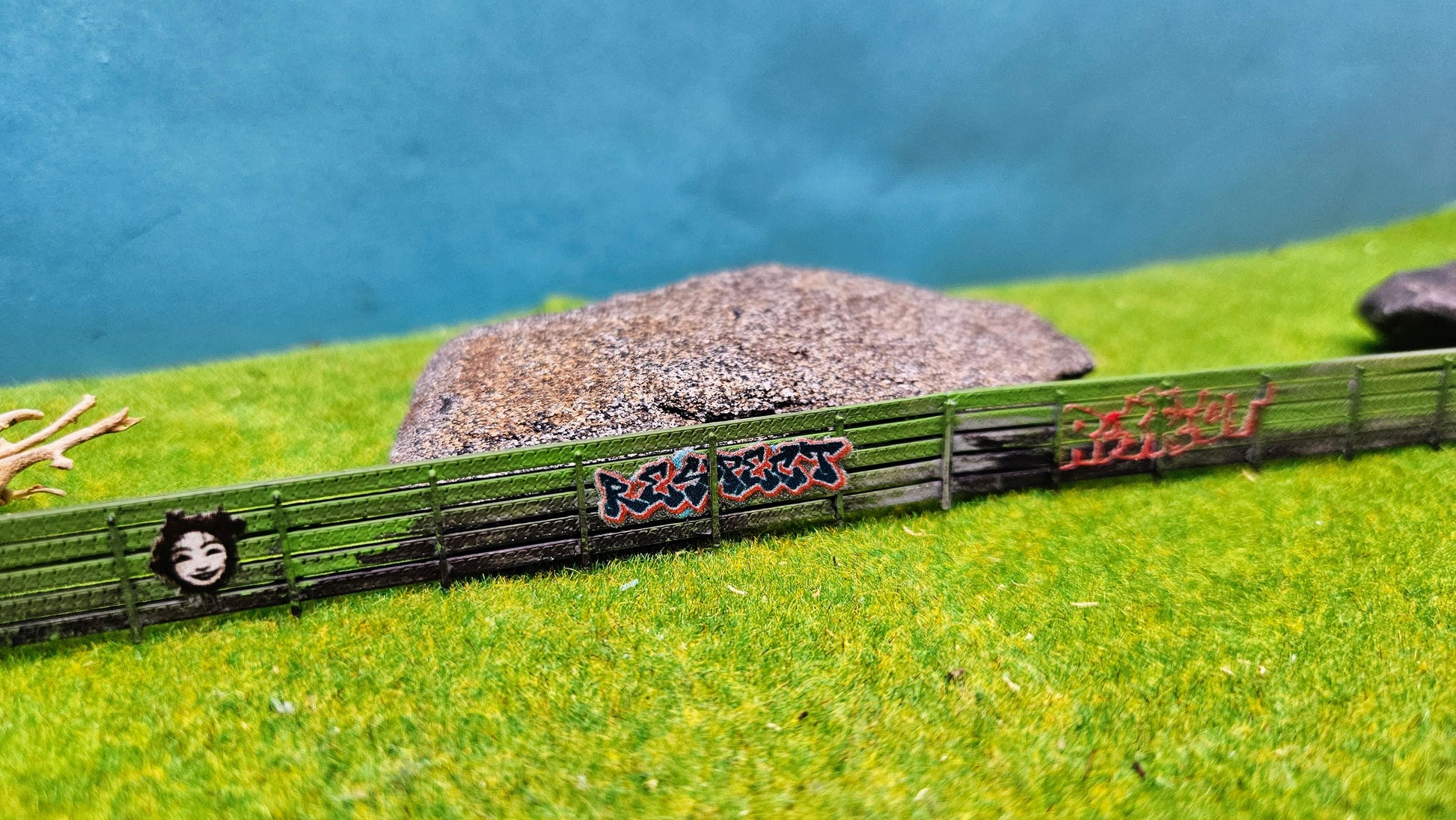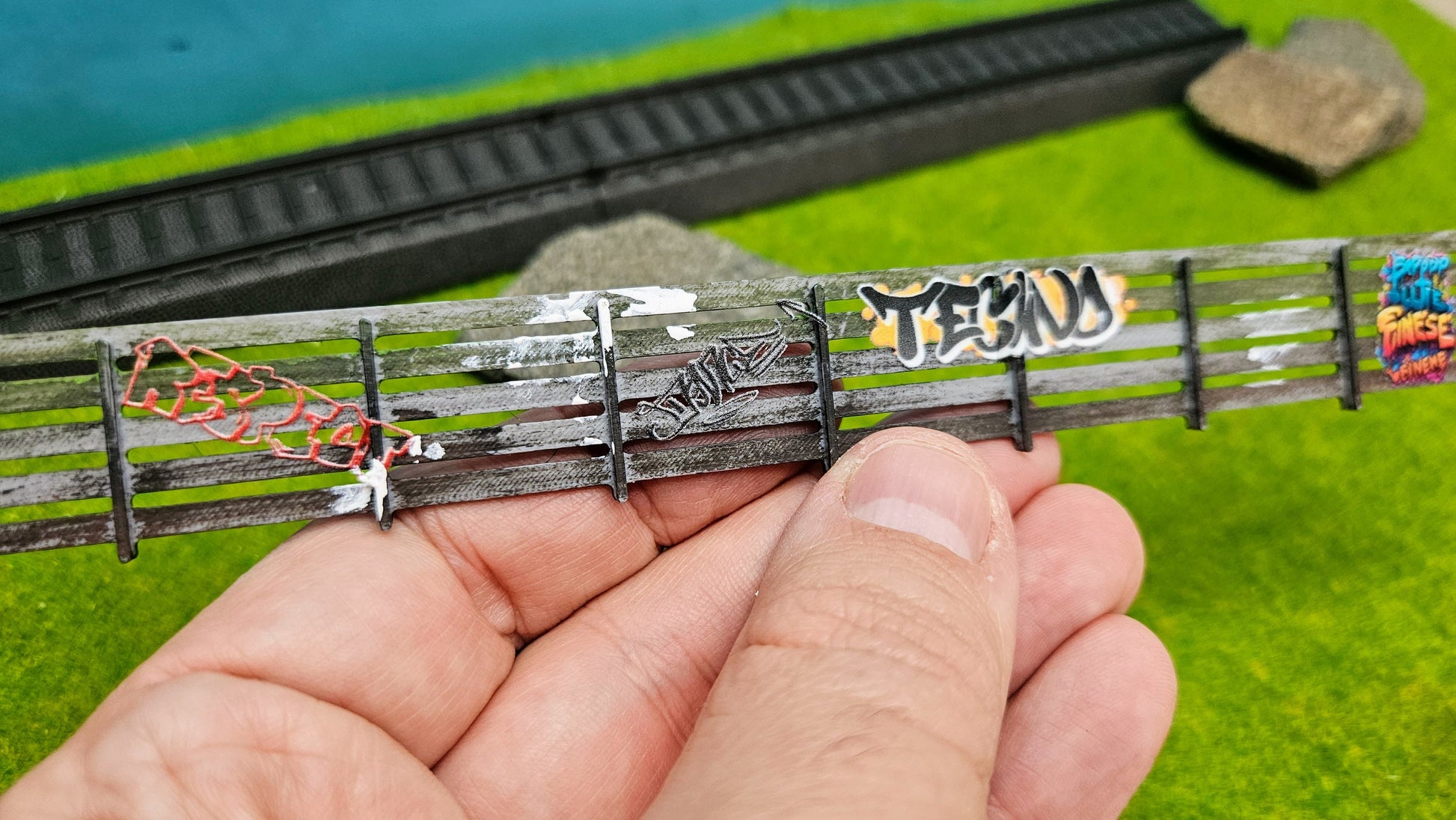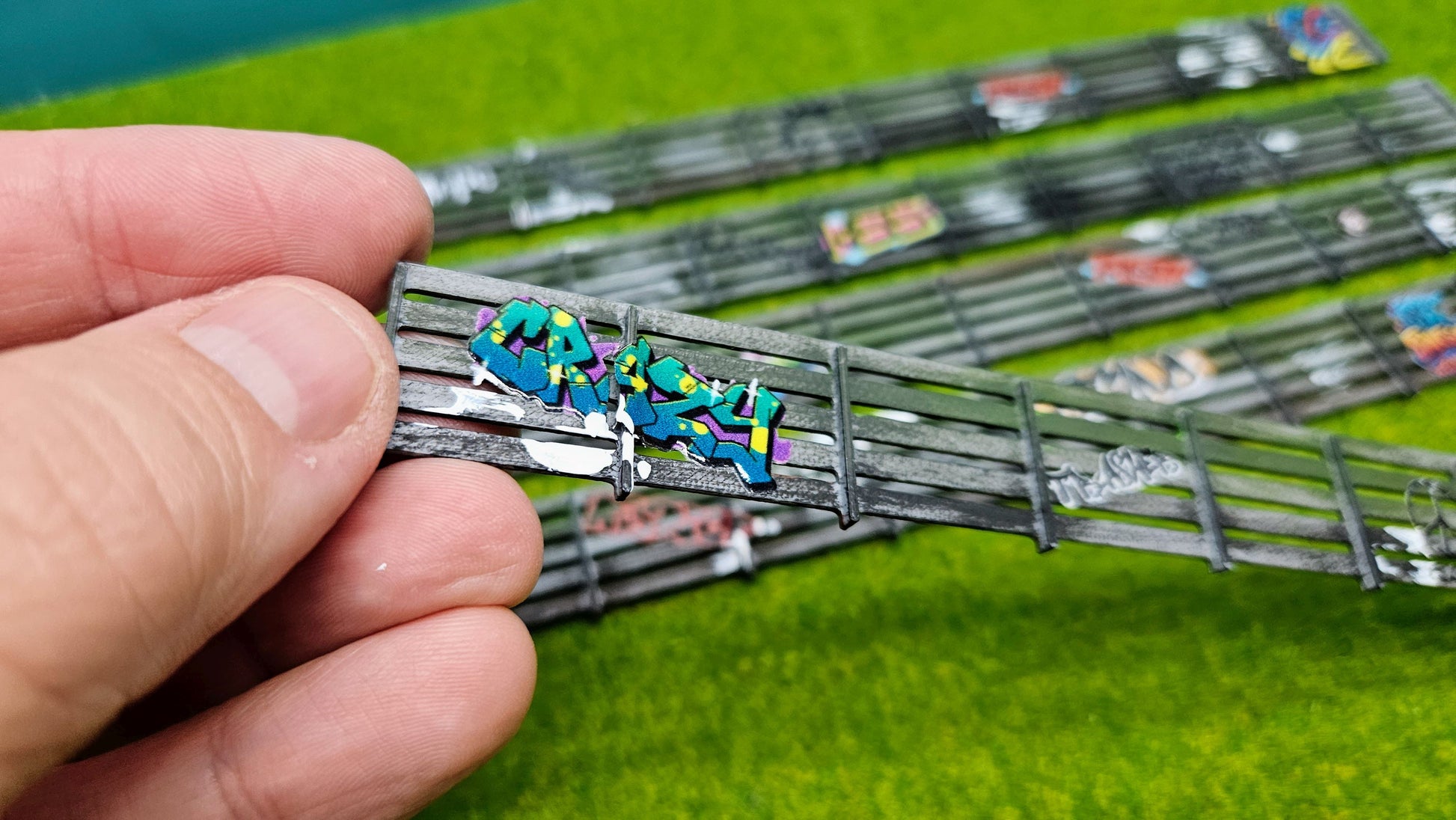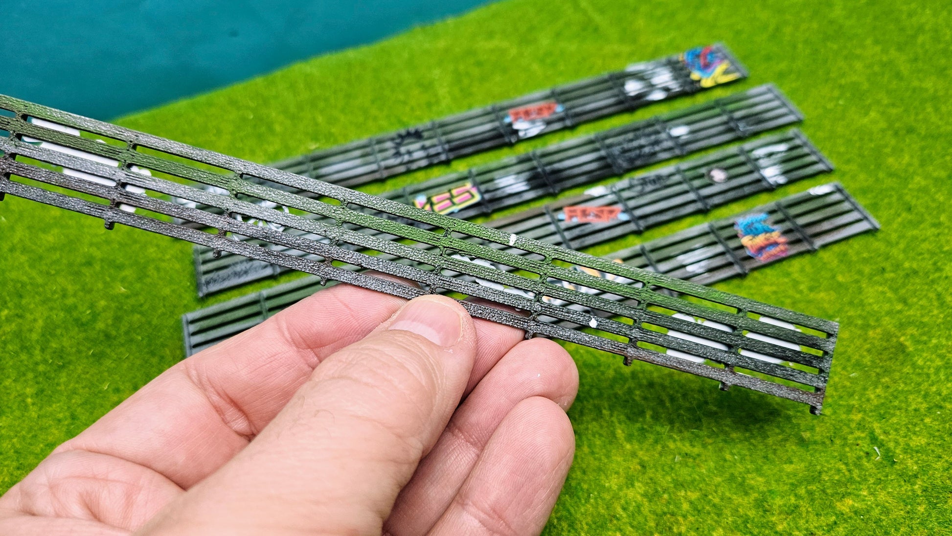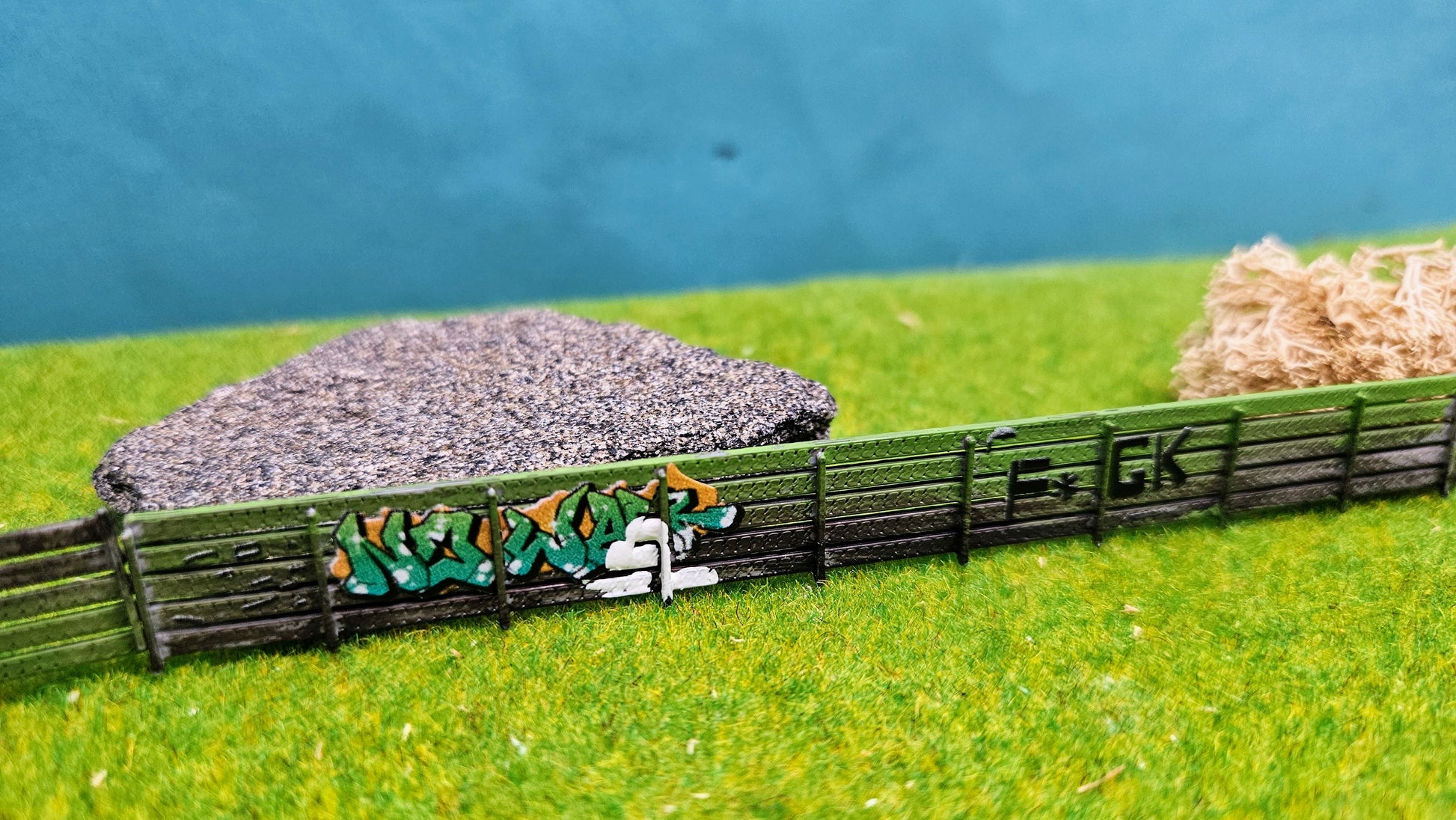 Modell eines massiven Beton-Sichtschutzzauns fertig gestaltet im Graffiti Look zur realistischen Ausgestaltung von Wohnanlagen, Industriehöfen oder abgegrenzten Arealen auf Modellanlagen. Die Zaunelemente bestehen aus FDM-gedrucktem PLA und überzeugen durch robuste Verarbeitung und einfache Handhabung.