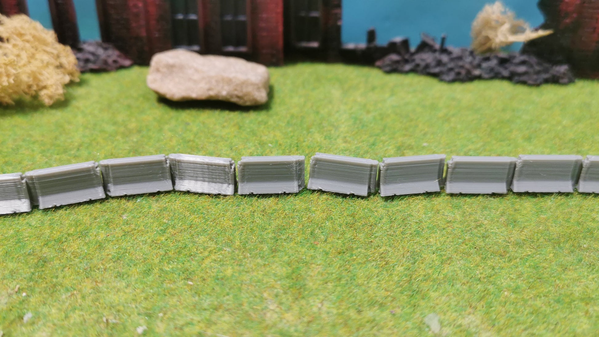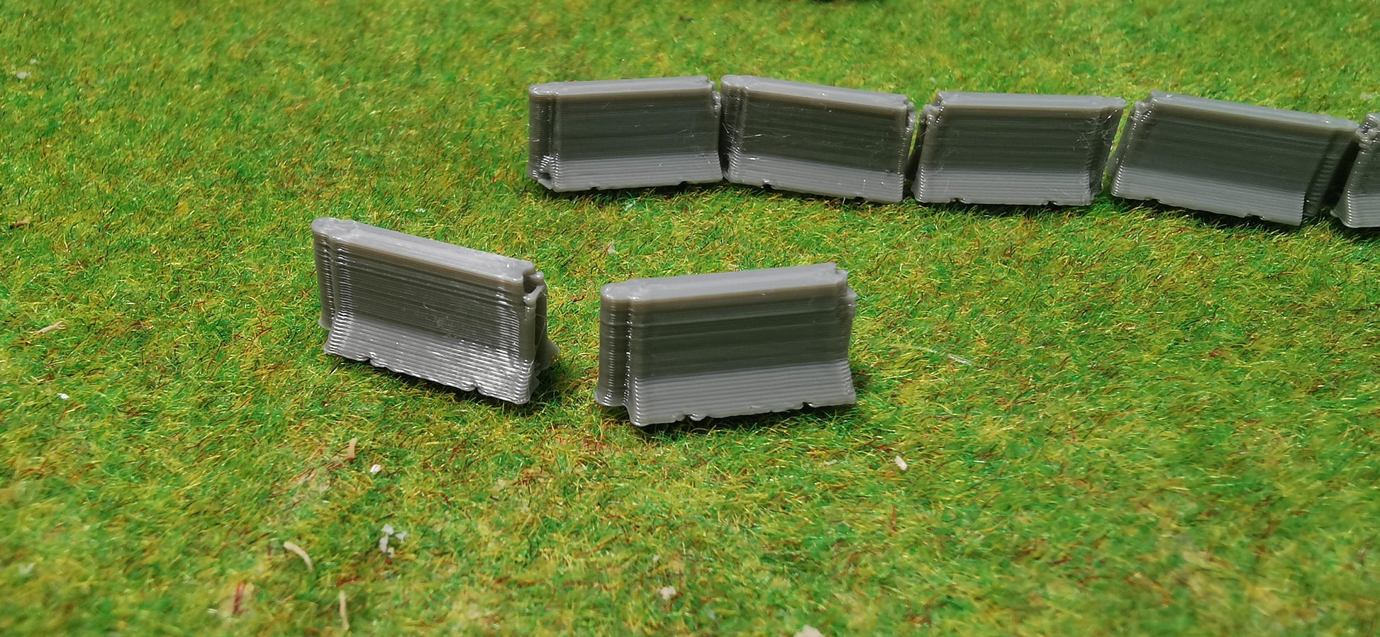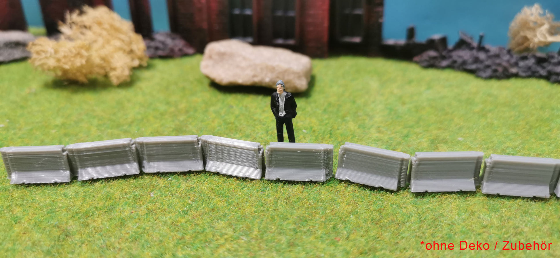 Die Barrieren lassen sich flexibel einsetzen, kombinieren oder anmalen. Sie sind leicht und stabil – ideal für den Einsatz auf Dioramen, Modellbahnanlagen oder für Tabletop-Gelände.