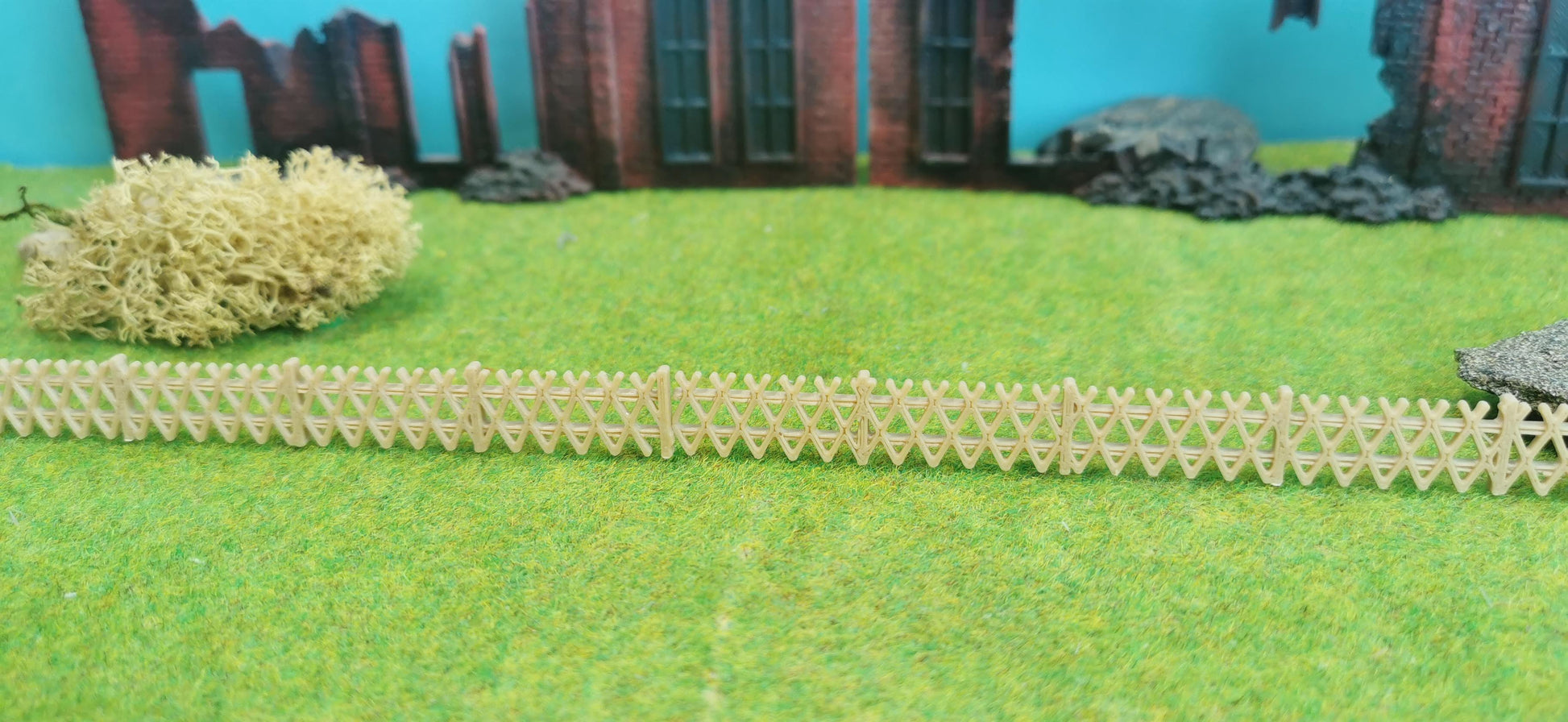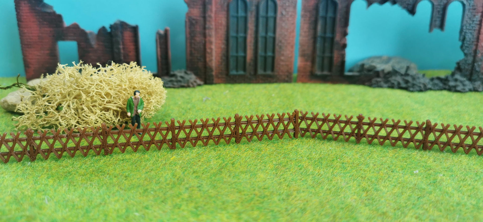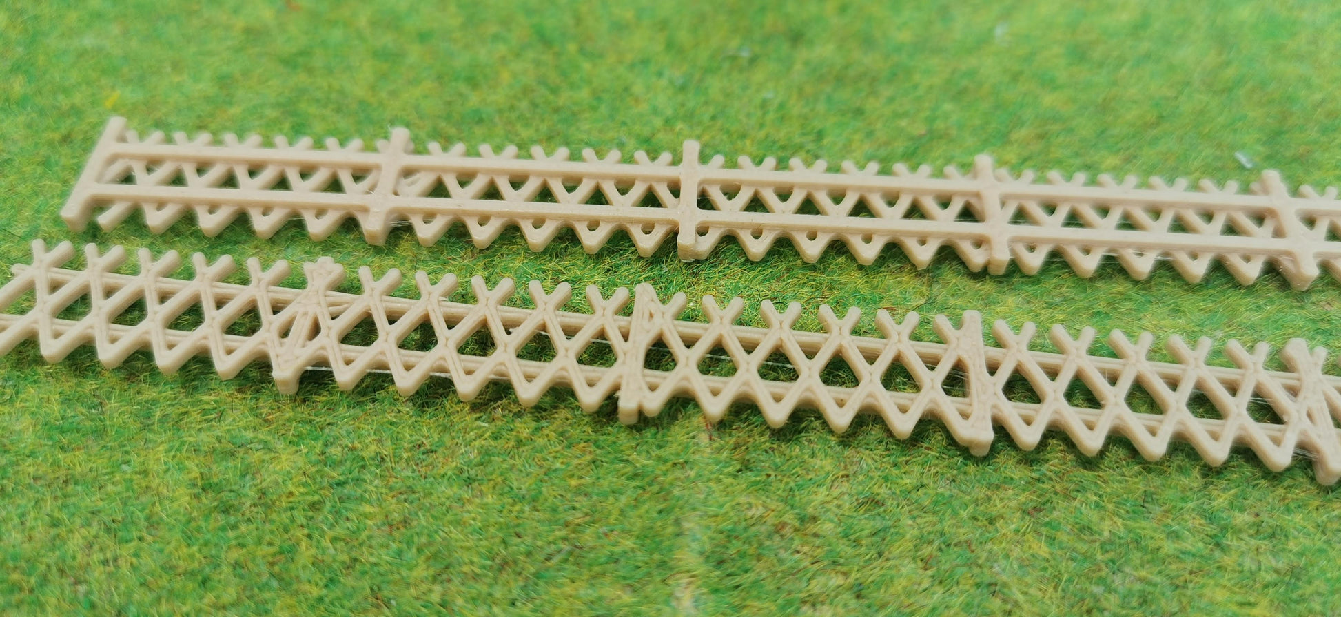 Klassischer Jägerzaun zur realistischen Gestaltung von Grundstücken, Gärten und ländlichen Szenen auf Modellbahnanlagen und Dioramen. Der Zaun ist aus PLA im FDM-3D-Druckverfahren gefertigt – stabil, leicht und detailliert.