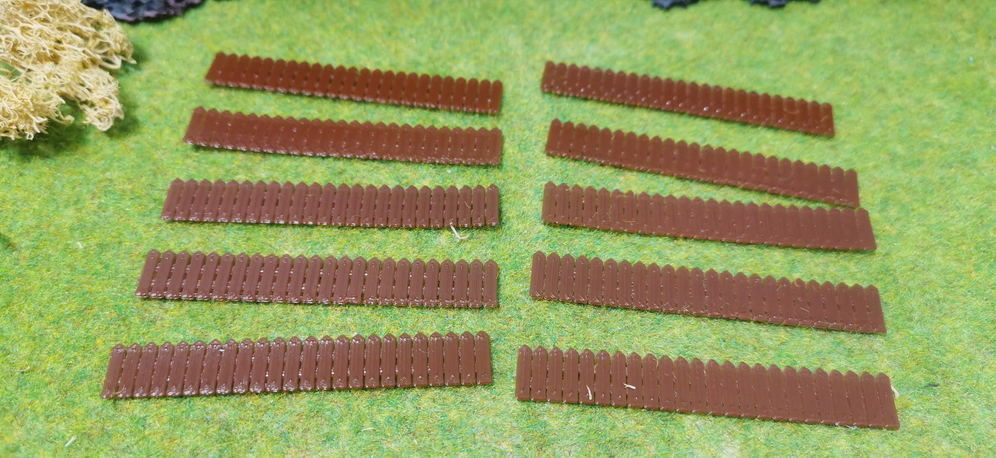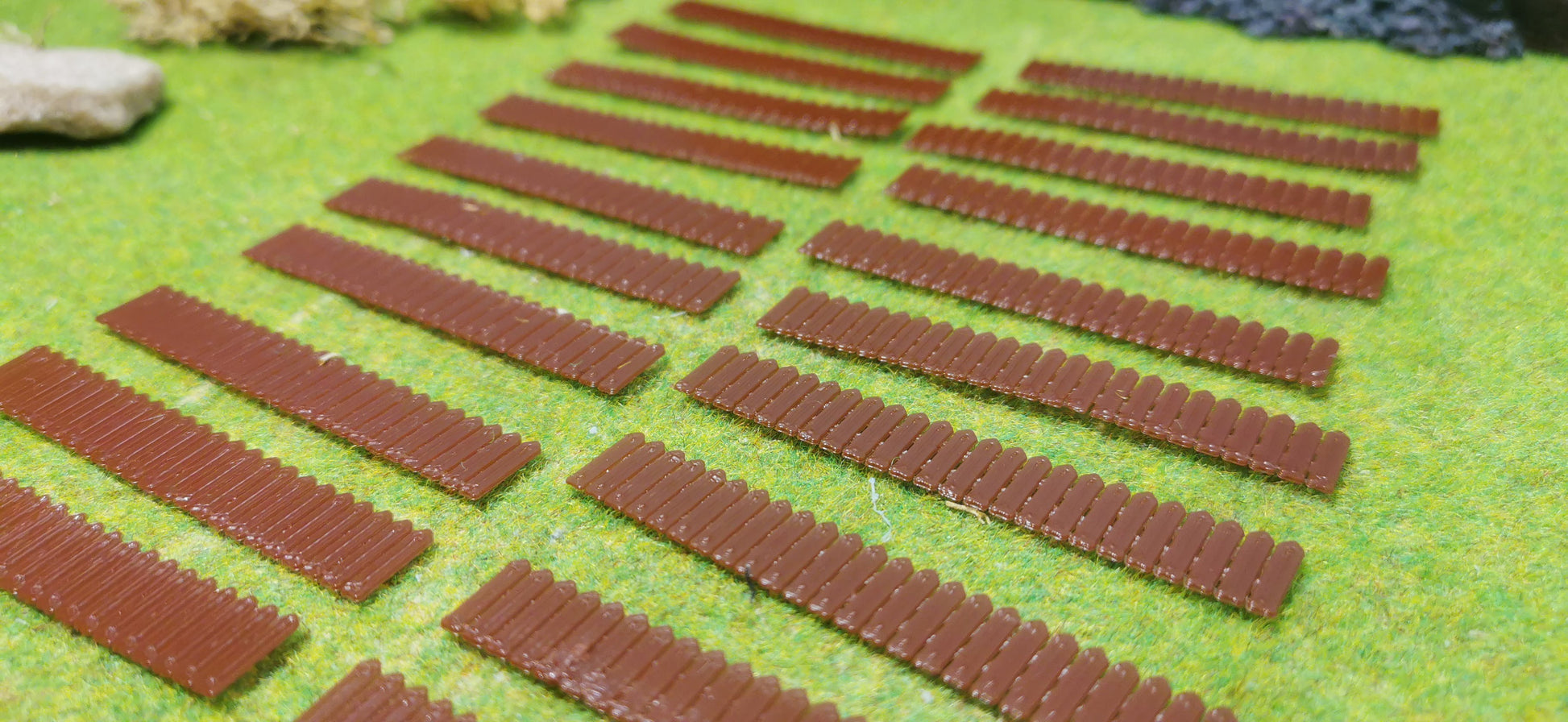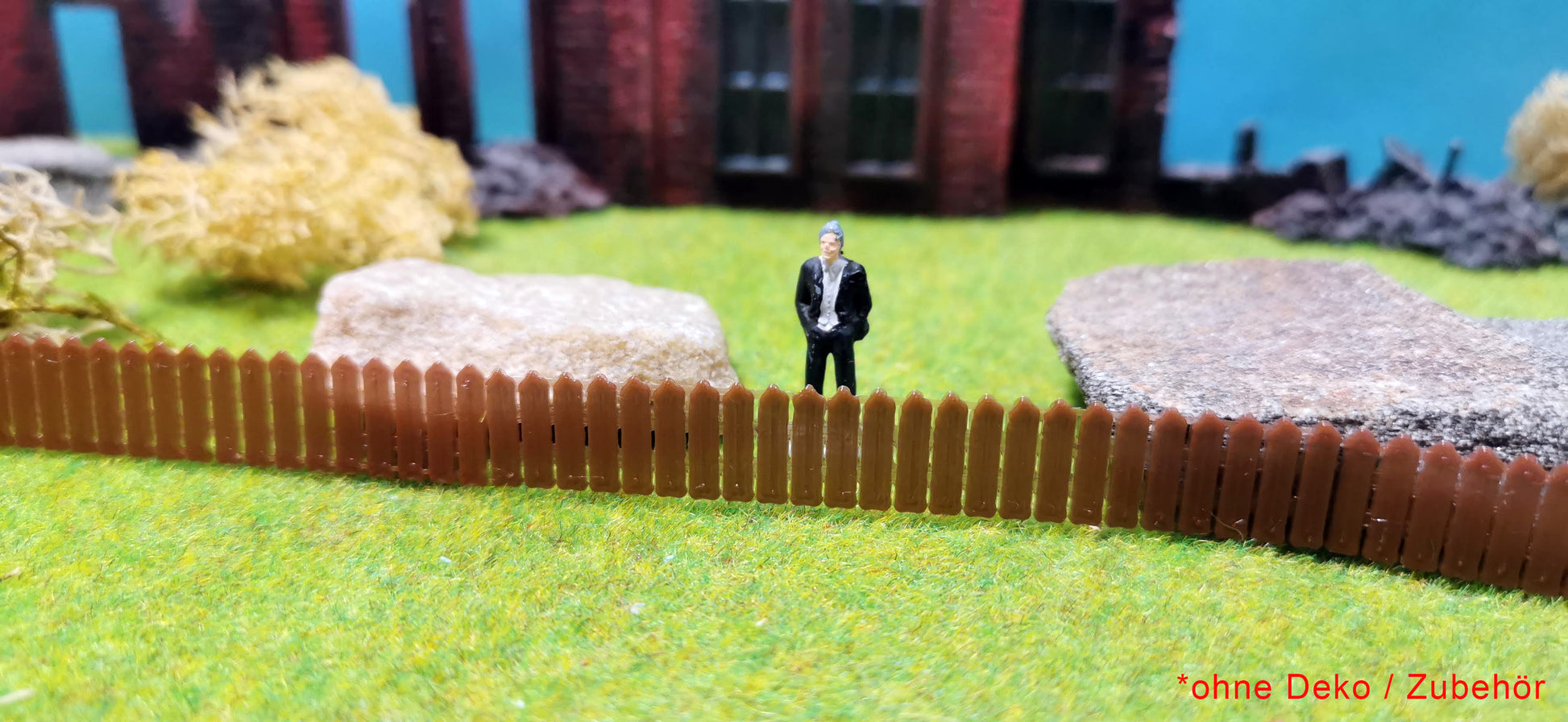 Die Zäune lassen sich leicht kürzen, kombinieren oder an Geländeformen anpassen. Befestigung mit handelsüblichen Modellbauklebern möglich.