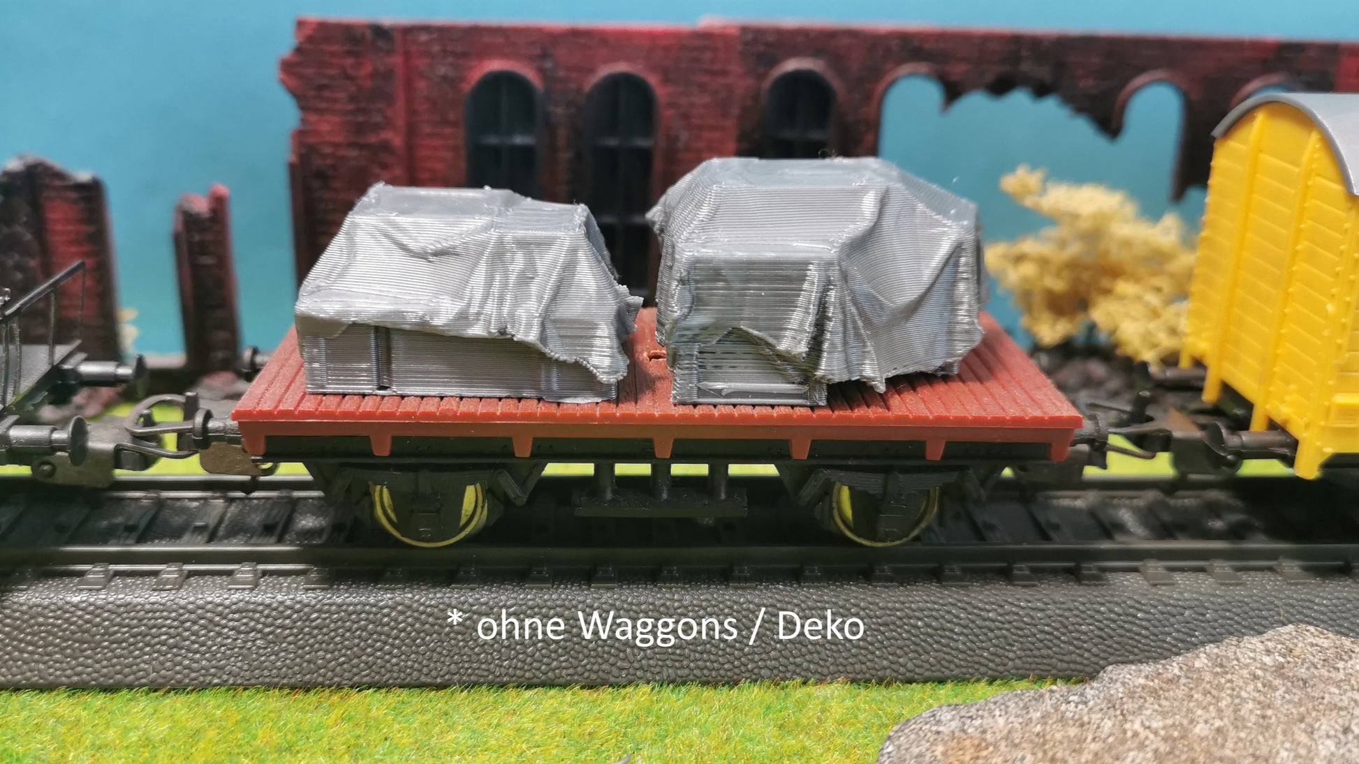Realistisches Ladegut für Güterwagen, LKW, Baustellen und Industrieanlagen. Die detailgetreuen Kistenstapel mit Plane sind im hochwertigen 3D-Druck gefertigt und passen perfekt in verschiedene Modellbahn-Maßstäbe. Ideal für Dioramen, Waggonladungen und realistische Modellbau-Szenen.