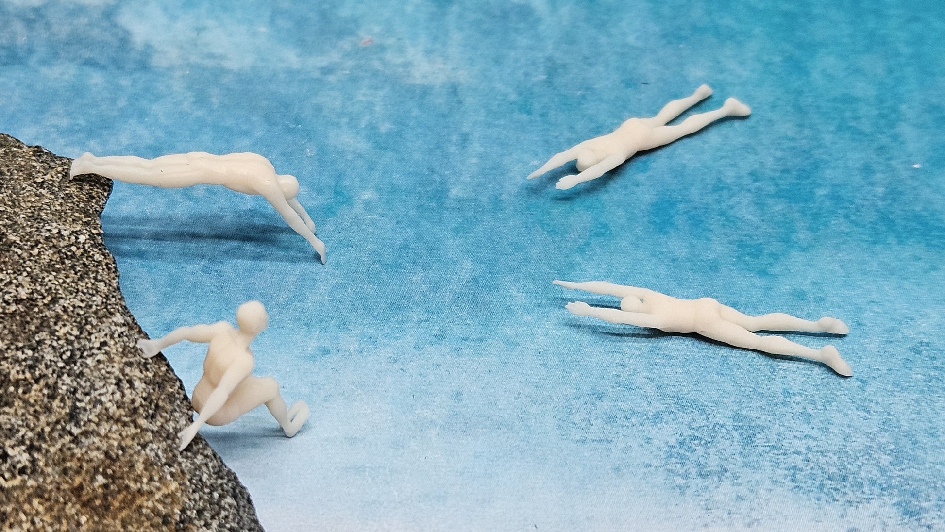 Detailliertes Figuren-Set aus hochwertigem Resin – bestehend aus 4 Figuren im Maßstab 1:87: Zwei Schwimmer sowie zwei Klippenspringer in actionreicher Pose.
