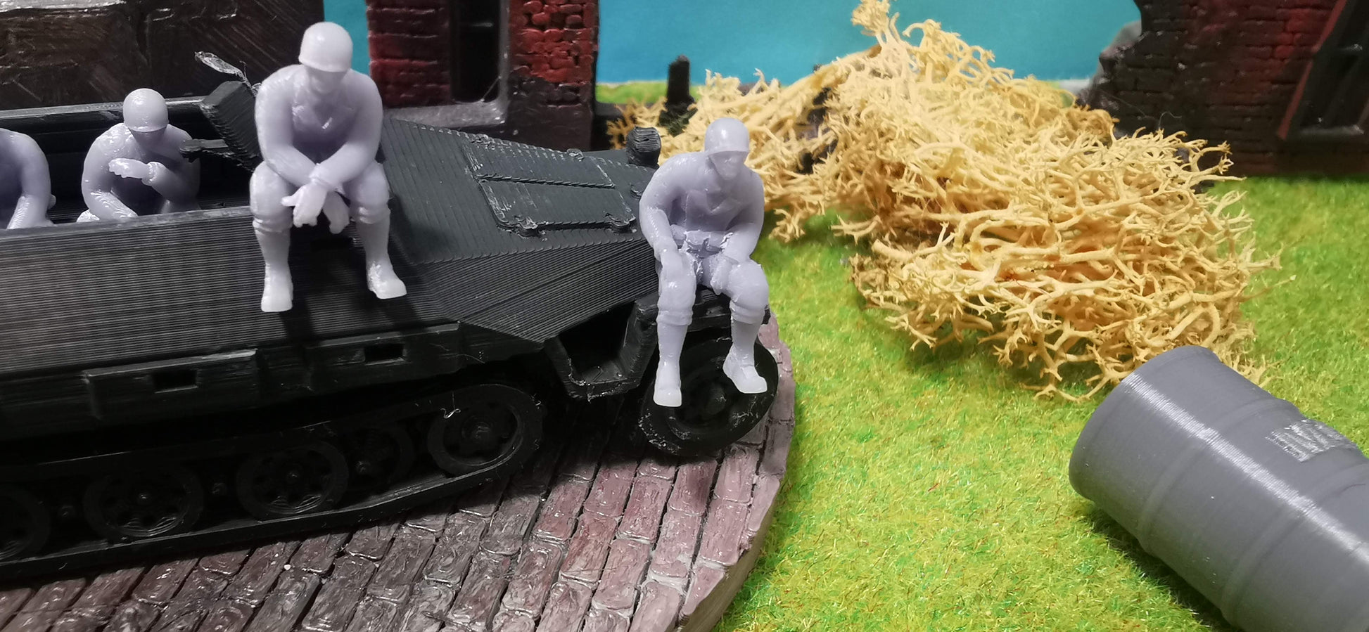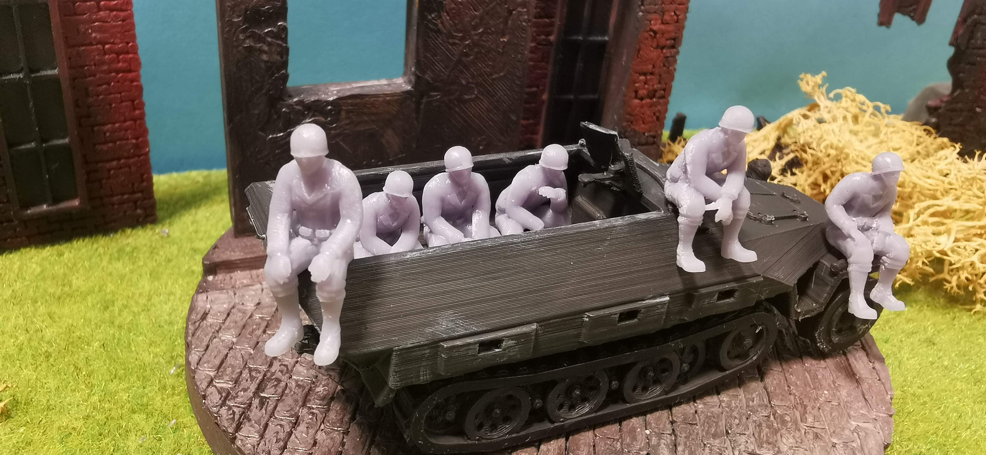 Dieses Set beinhaltet sechs US-Soldaten aus dem Zweiten Weltkrieg in sitzender Position – ideal zur Platzierung auf Fahrzeugen, Panzern oder in Schützenstellungen.