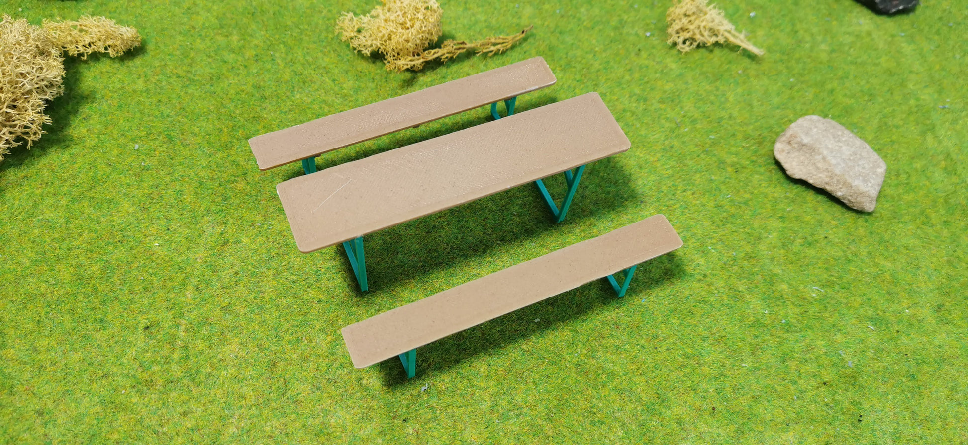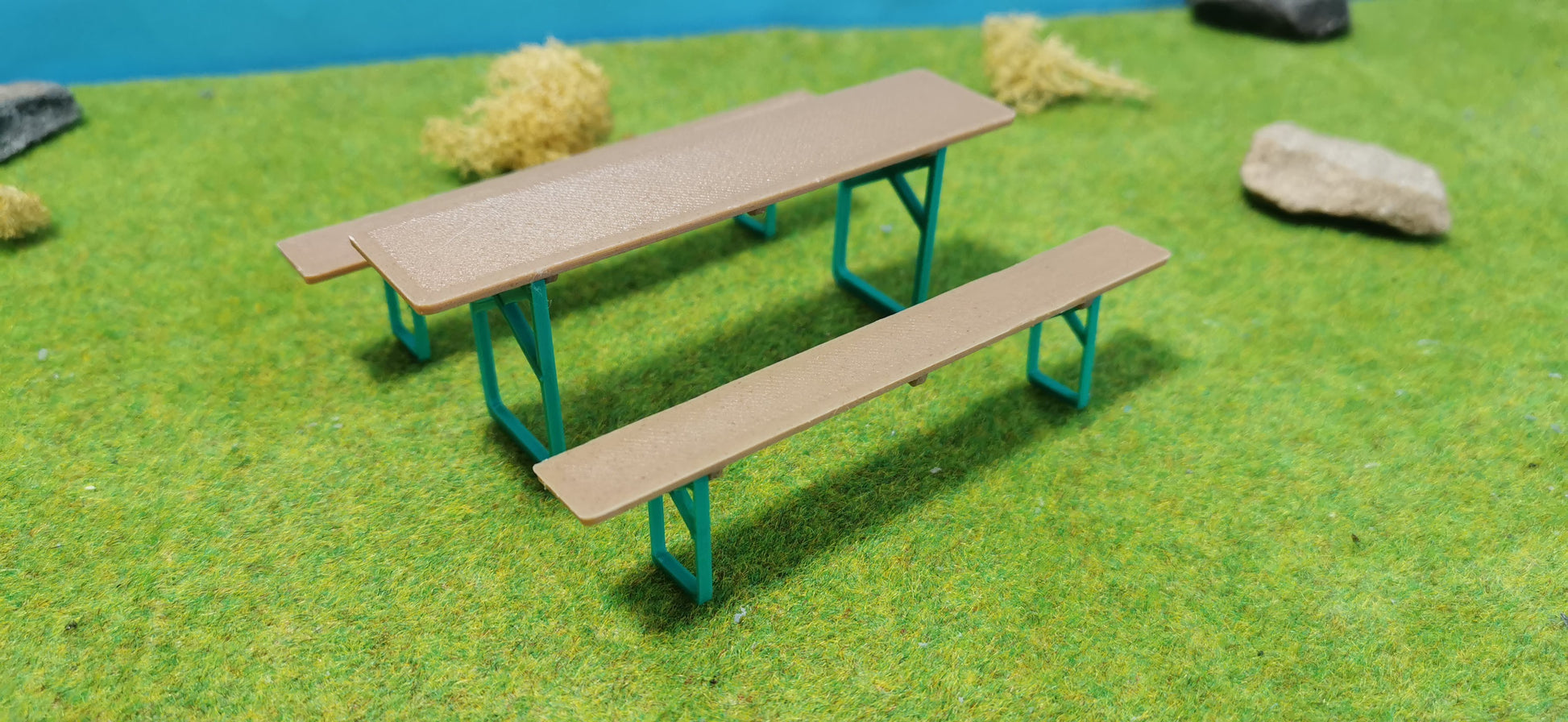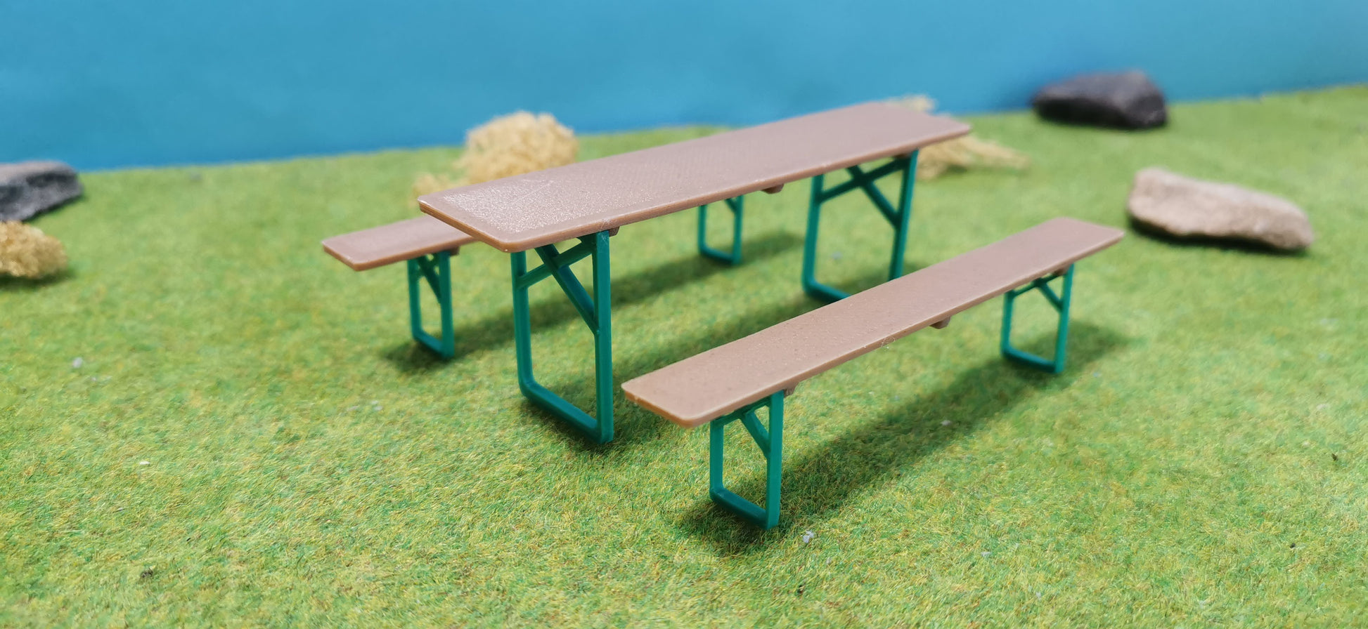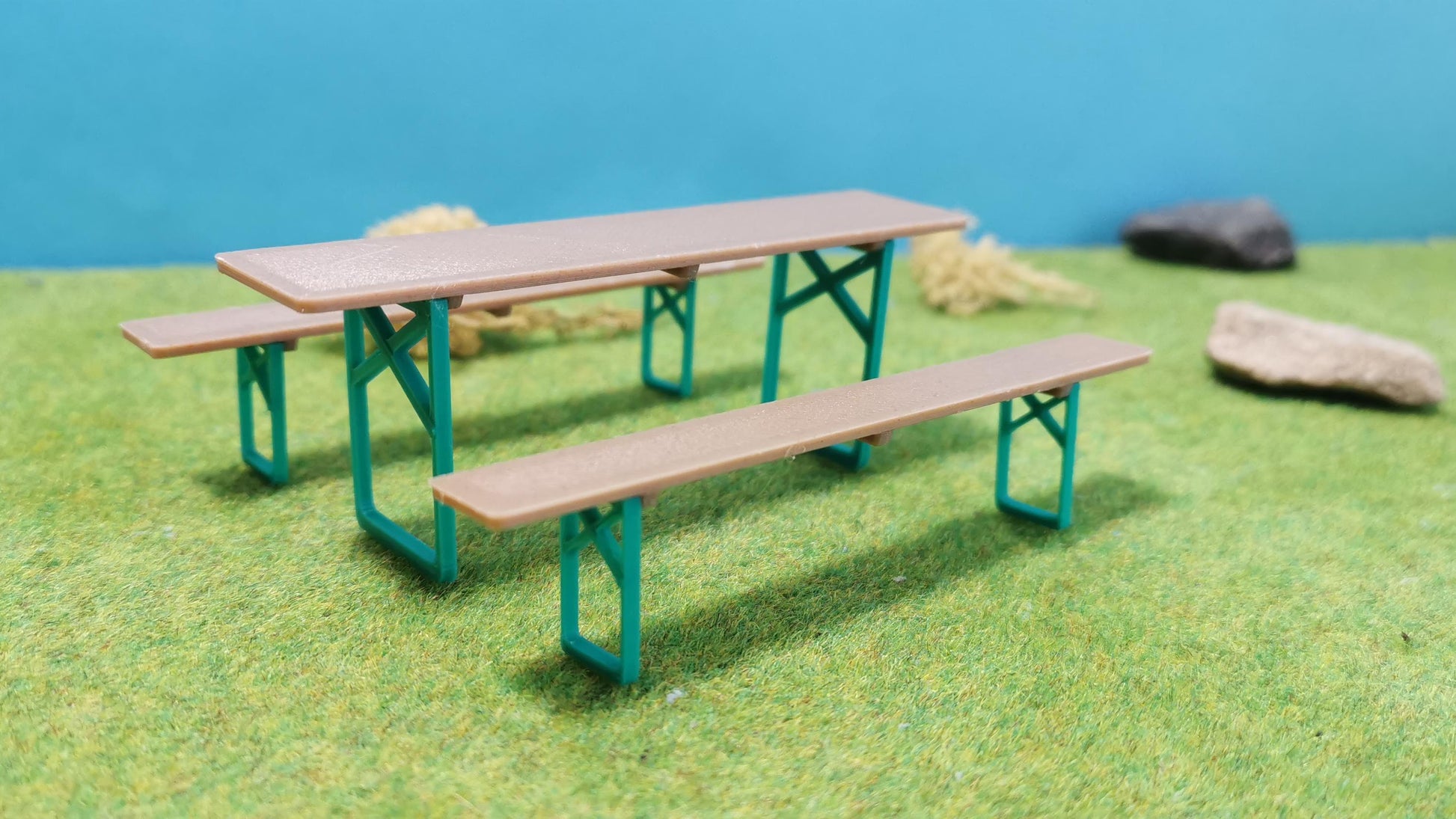 Diese detailreiche Mini-Bierzeltgarnitur ist in mehreren Maßstäben erhältlich und eignet sich ideal als Ergänzung für Modellbahnen, Spiellandschaften oder realistisch gestaltete Dioramen.