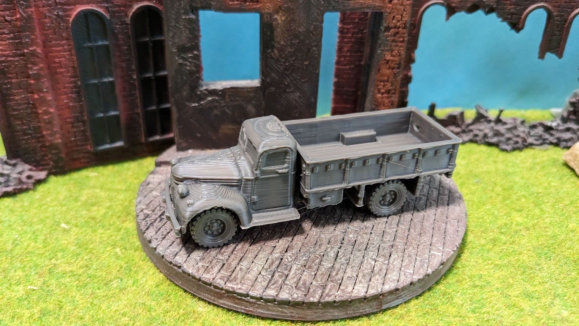 Der Chevrolet 3T GS LKW "Pritsche" war ein weit verbreiteter alliierter Militärlastwagen des Zweiten Weltkriegs, der für den Transport von Ausrüstung, Nachschub und Personal genutzt wurde. Als Teil der Canadian Military Pattern (CMP)-Serie zeichnete sich das Fahrzeug durch seine robuste Bauweise, gute Geländetauglichkeit und einfache Wartung aus. Die offene Pritschenversion war besonders praktisch für schnelle Lade- und Entladevorgänge im Feldeinsatz.