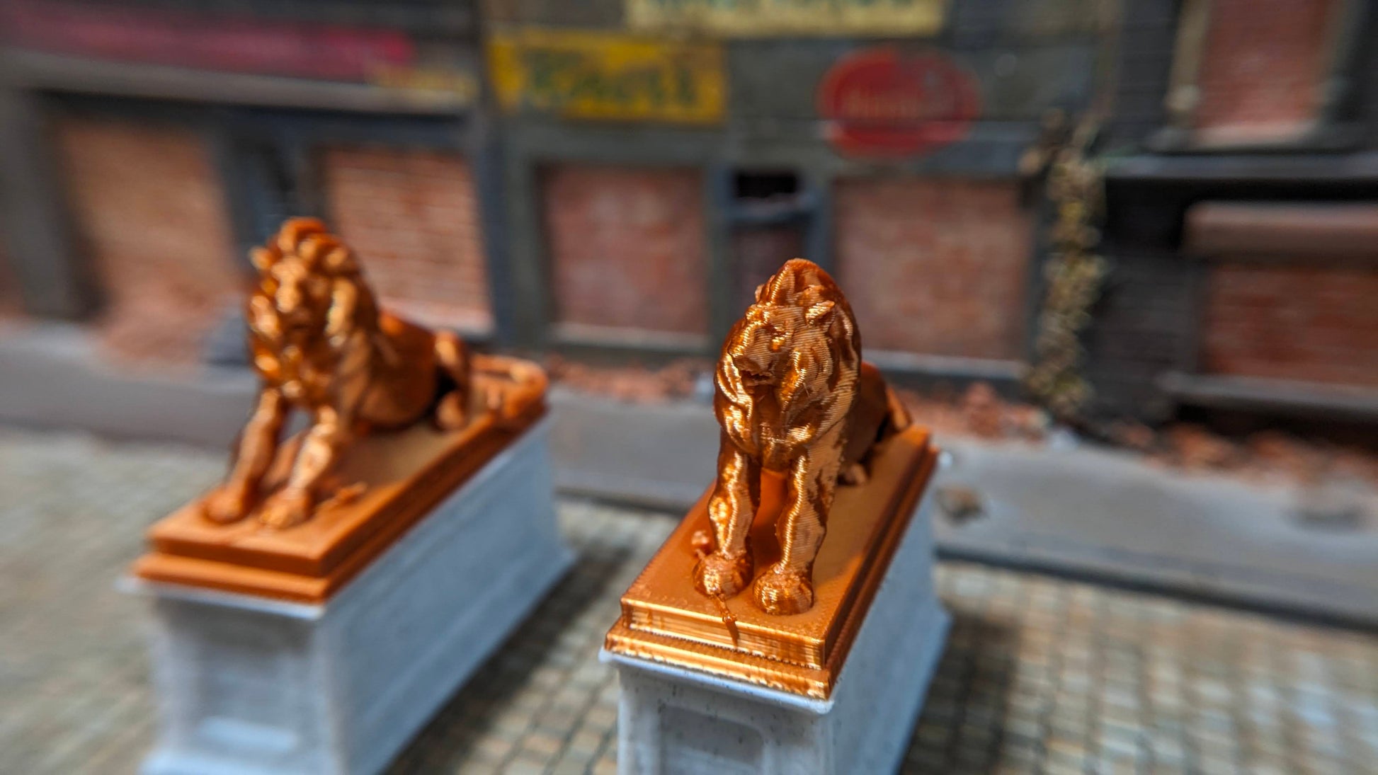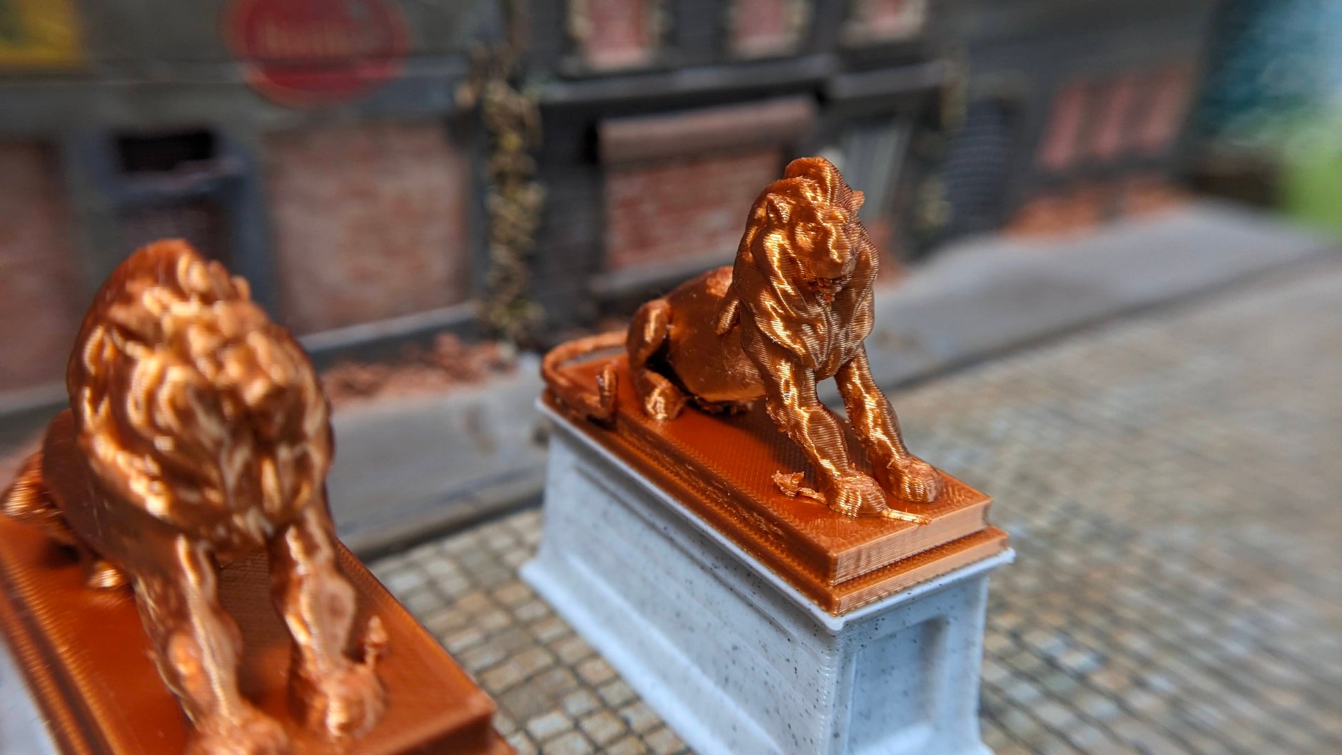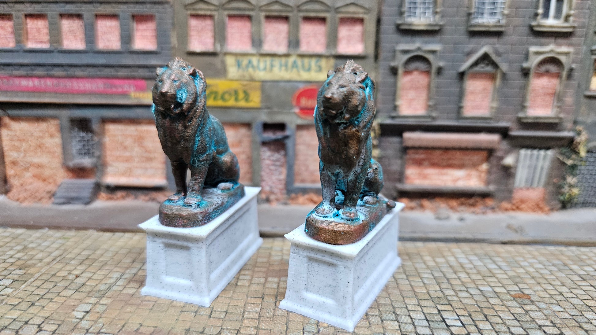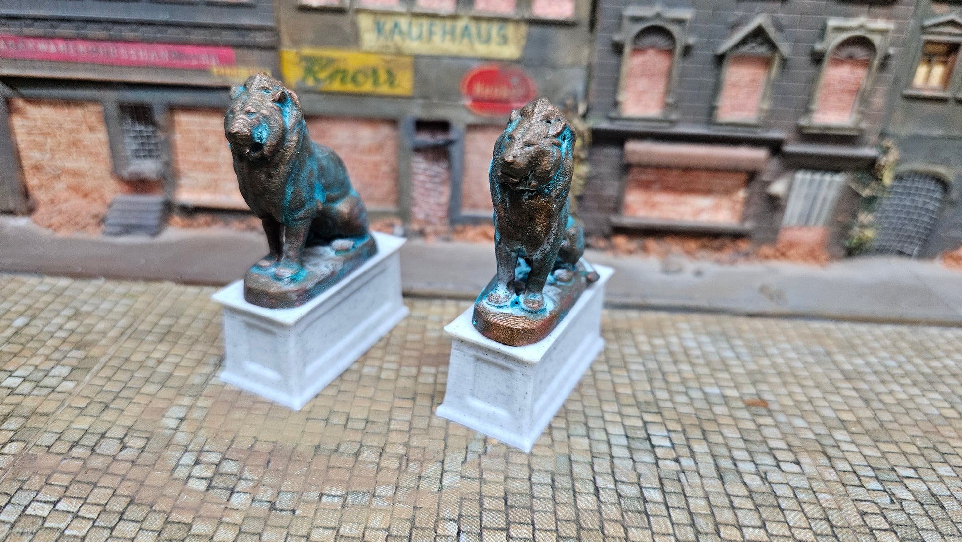 Verleihen Sie Ihren Modellanlagen, Bahnhöfen oder Gebäudelayouts einen imposanten und historischen Eingangsbereich mit diesem Set aus zwei sitzenden Löwenstatuen auf passenden Podesten. Perfekt im Maßstab H0 (1:87) gestaltet, sind diese Statuen ein beeindruckendes Detail für jede Szenerie.