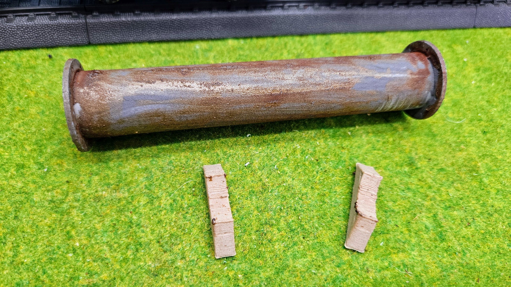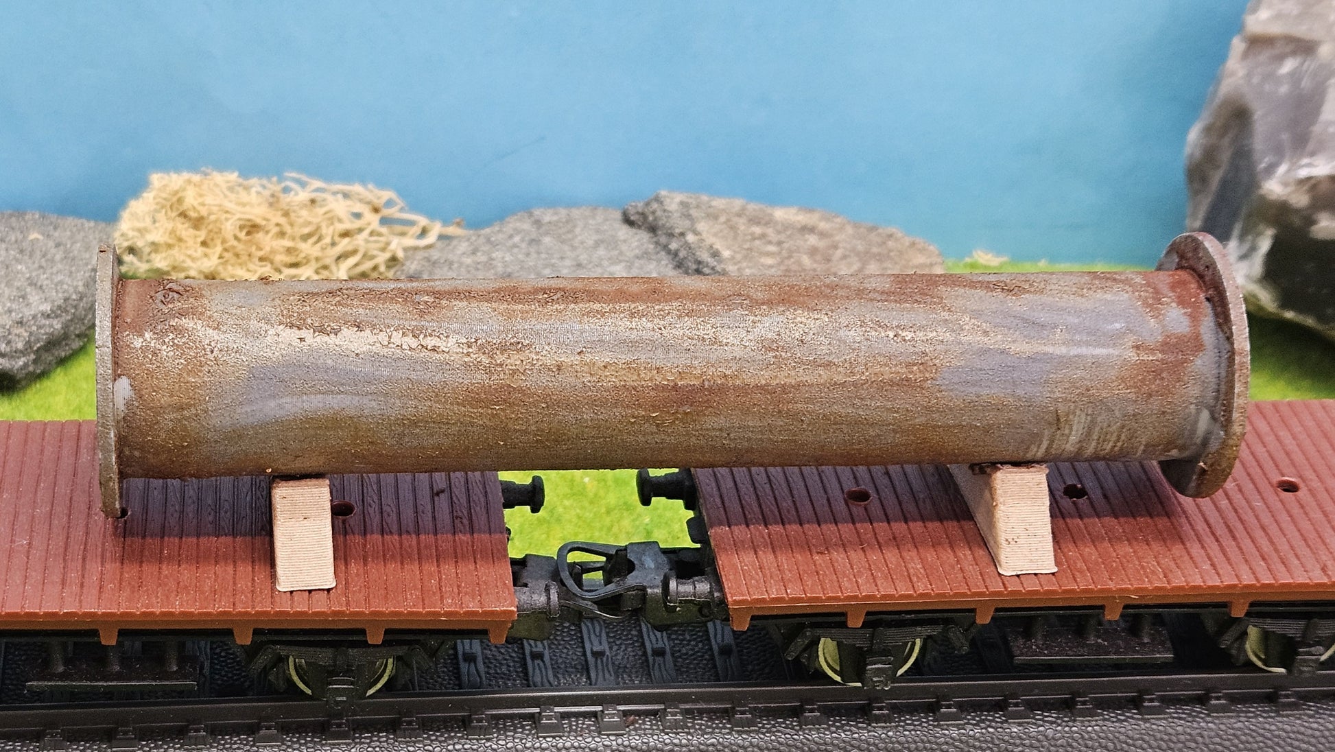 Detailreiches und handgealtertes Flanschrohr als Ladegut für Flachwagen und Tiefladewagen. Im Maßstab H0 (1:87) hat das Rohr eine Länge von ca. 115 mm, in TT (1:120) ca. 83 mm und in N (1:160) ca. 63 mm. Das Rohr ist jeweils auf zwei stabilen Holzböcken aus Kunststoff montiert. Die realistische Rostoptik wird per Hand aufgetragen und sorgt für eine authentische Patina.