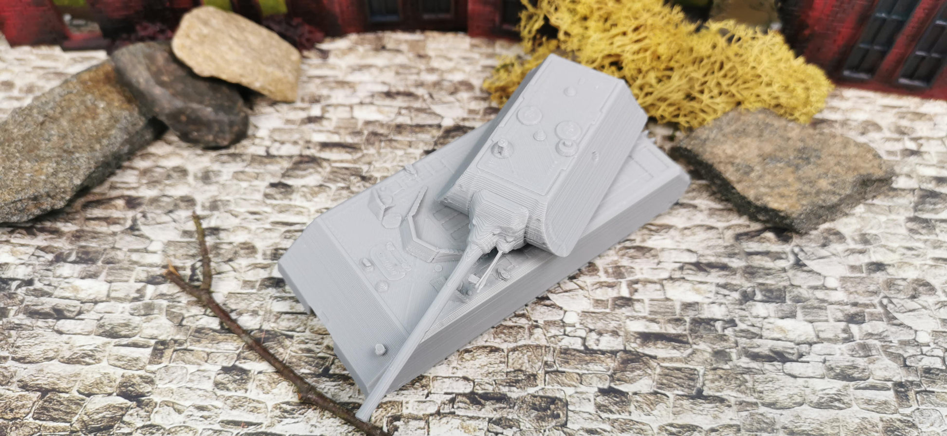 - Dargestellt mit riesigem Geschützturm und massiver Wanne